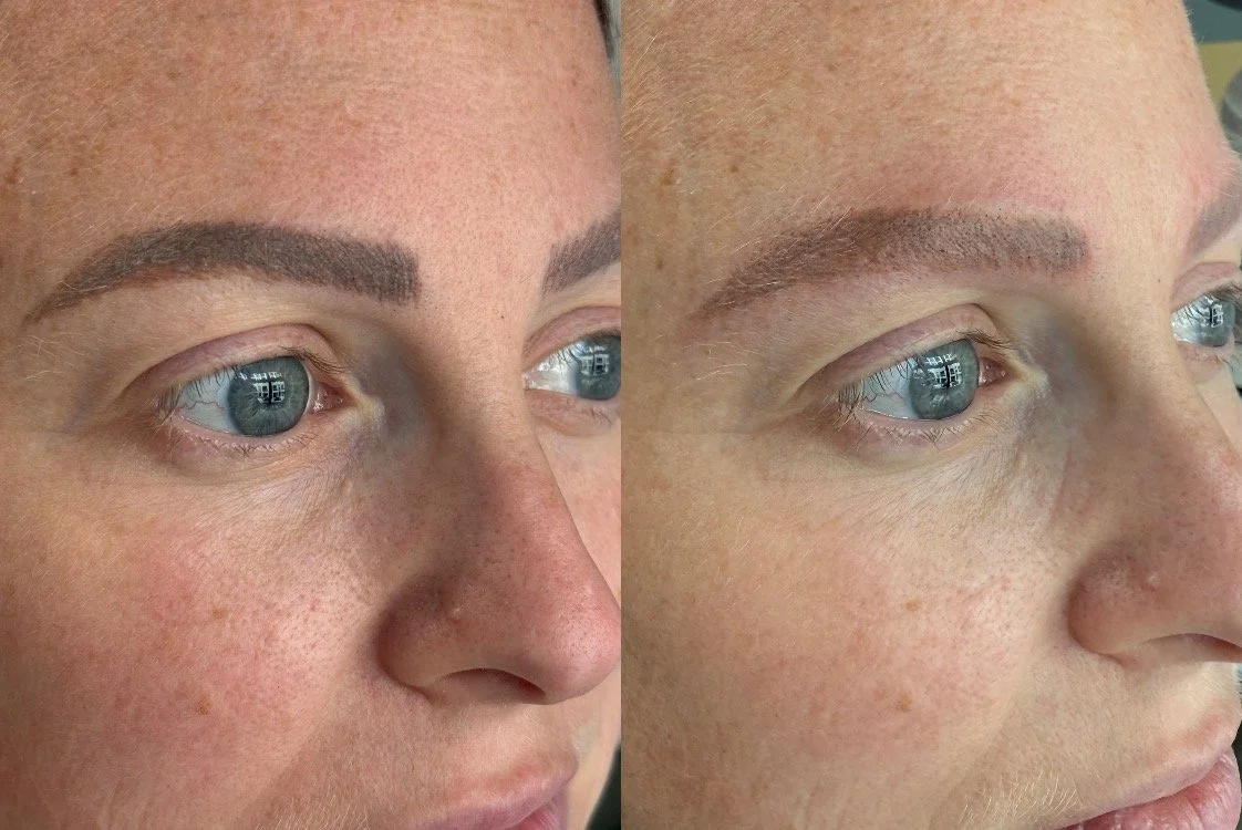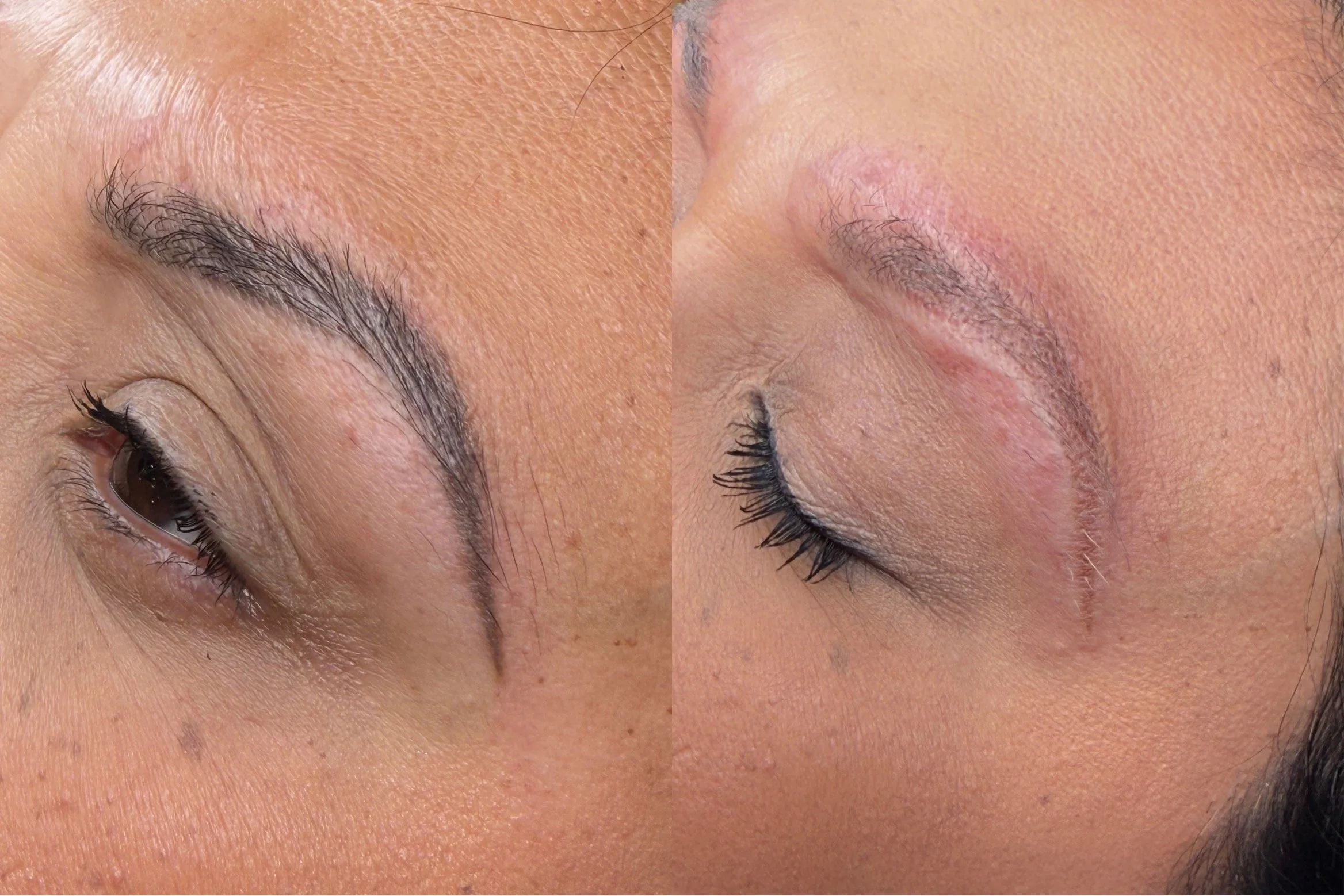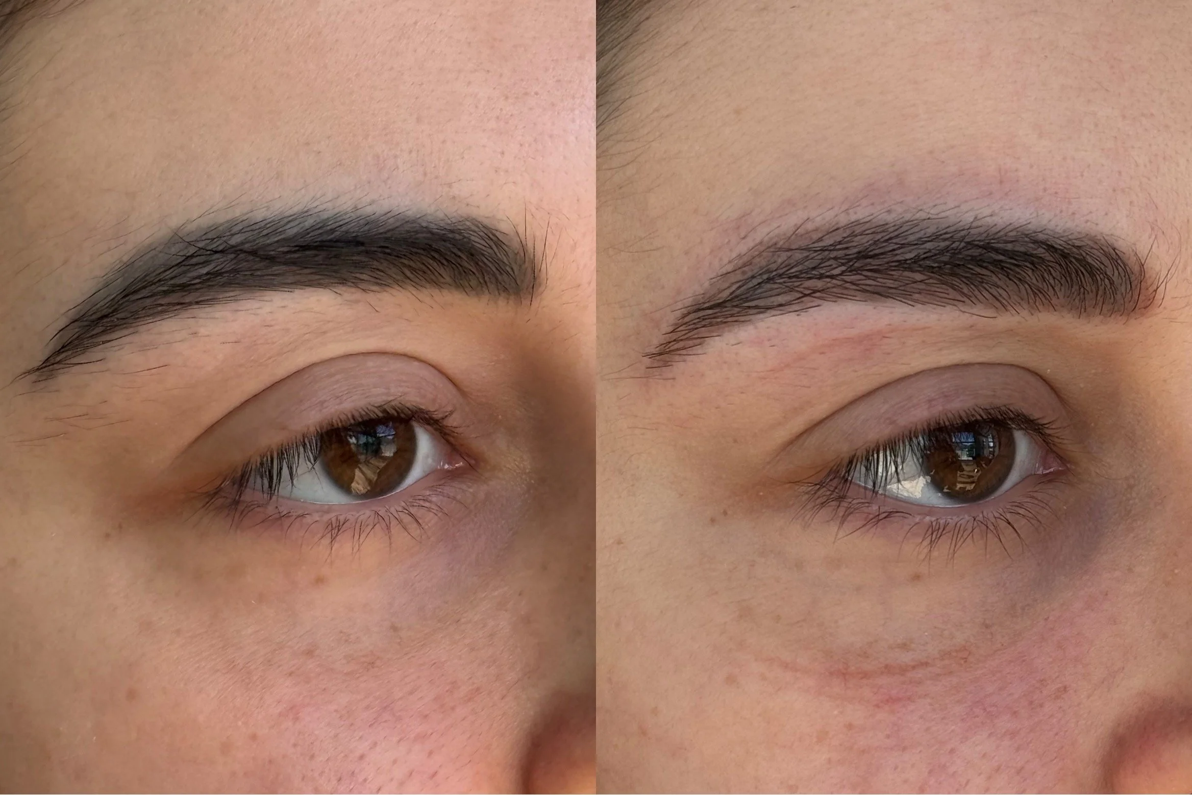 Laser microblading removal is a safe and effective way to fade or completely remove unwanted brow pigment. Whether your brows have changed color over time, are uneven, or you simply want a fresh start, laser microblading treatment breaks down the pigment particles so your body can naturally clear them away. The below photos show results immediately after the first session — some redness and light swelling are normal and fade quickly. Results vary but with each session, the pigment continues to lift, revealing softer, more natural-looking skin beneath.