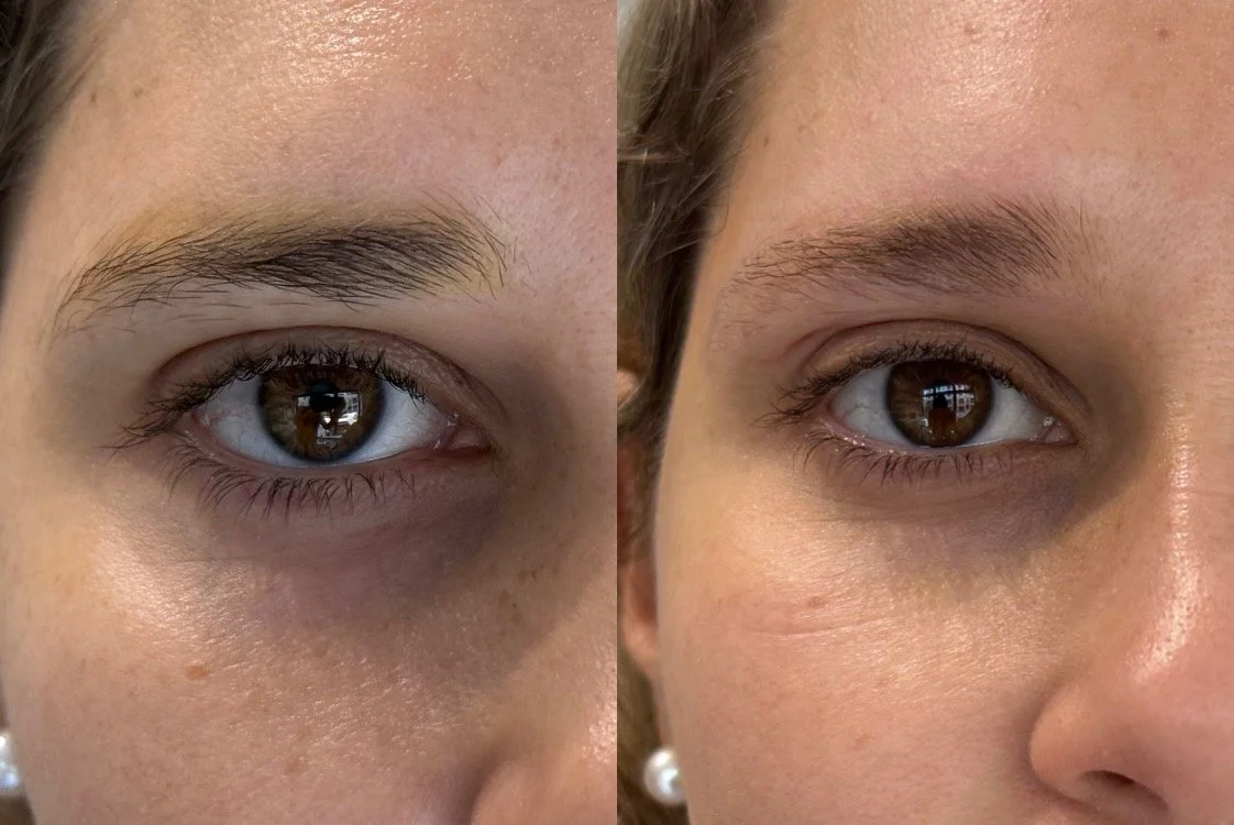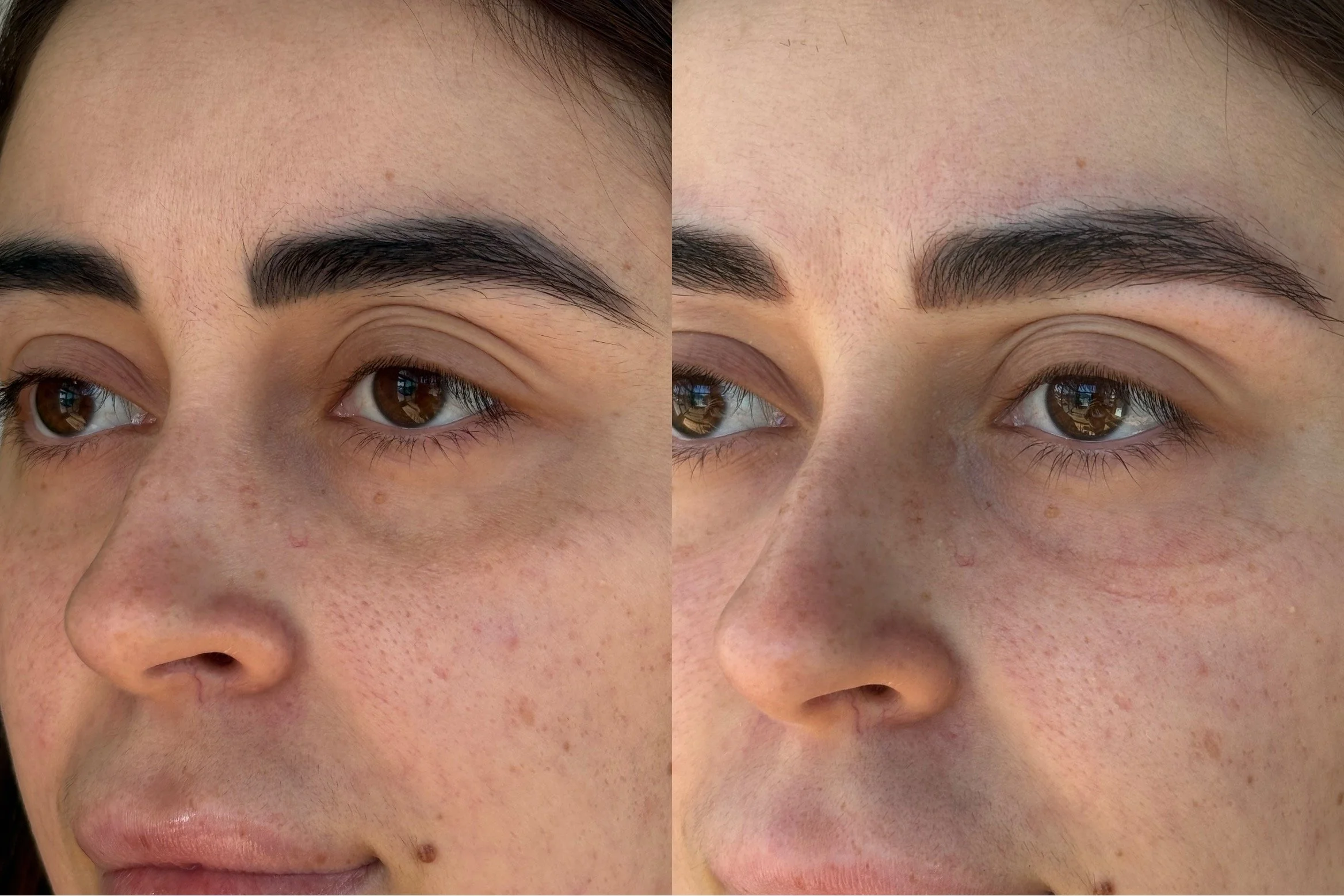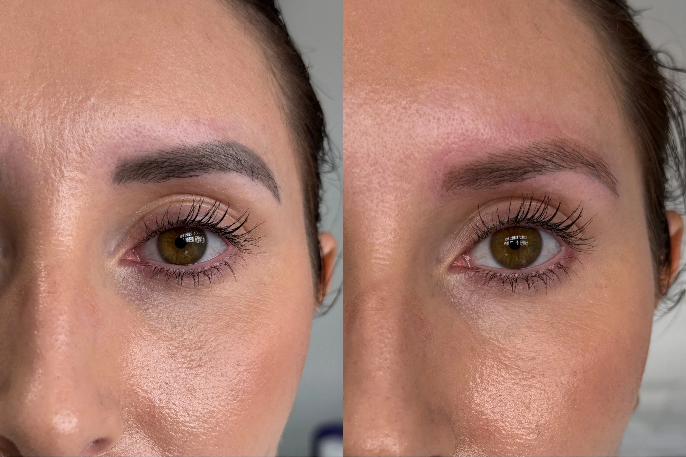 Laser microblading removal is a safe and effective way to fade or completely remove unwanted brow pigment. Whether your brows have changed color over time, are uneven, or you simply want a fresh start, laser microblading treatment breaks down the pigment particles so your body can naturally clear them away. The below photos show results immediately after the first session — some redness and light swelling are normal and fade quickly. Results vary but with each session, the pigment continues to lift, revealing softer, more natural-looking skin beneath.